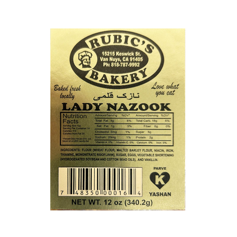 Yekta Store is proud to offer Rubic’s Bakery Lady Nazook 397 G. Lady Nazook made with flour, sugar, eggs, vegetable shortening, and vanillin.